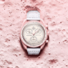 The Swatch x Omega Bioceramic Moonswatch Mission to Mars (SO33R100) pays tribute to our planetary neighbor by showcasing bright red tones contrasted with a white velcro strap. Both subdials are shaped like a rocket shape, perhaps in reference to humanity’s curiosity and long-time goal of reaching Mars. The Swatch x Omega Moonswatch Mission to Mars (SO33R100) features quartz movement, superluminova hours, minutes, and second hands, and is 3 bar water resistant.